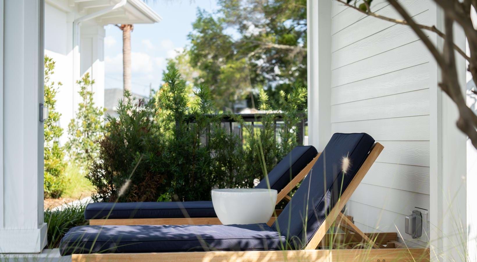 • a lounge chair outside a building