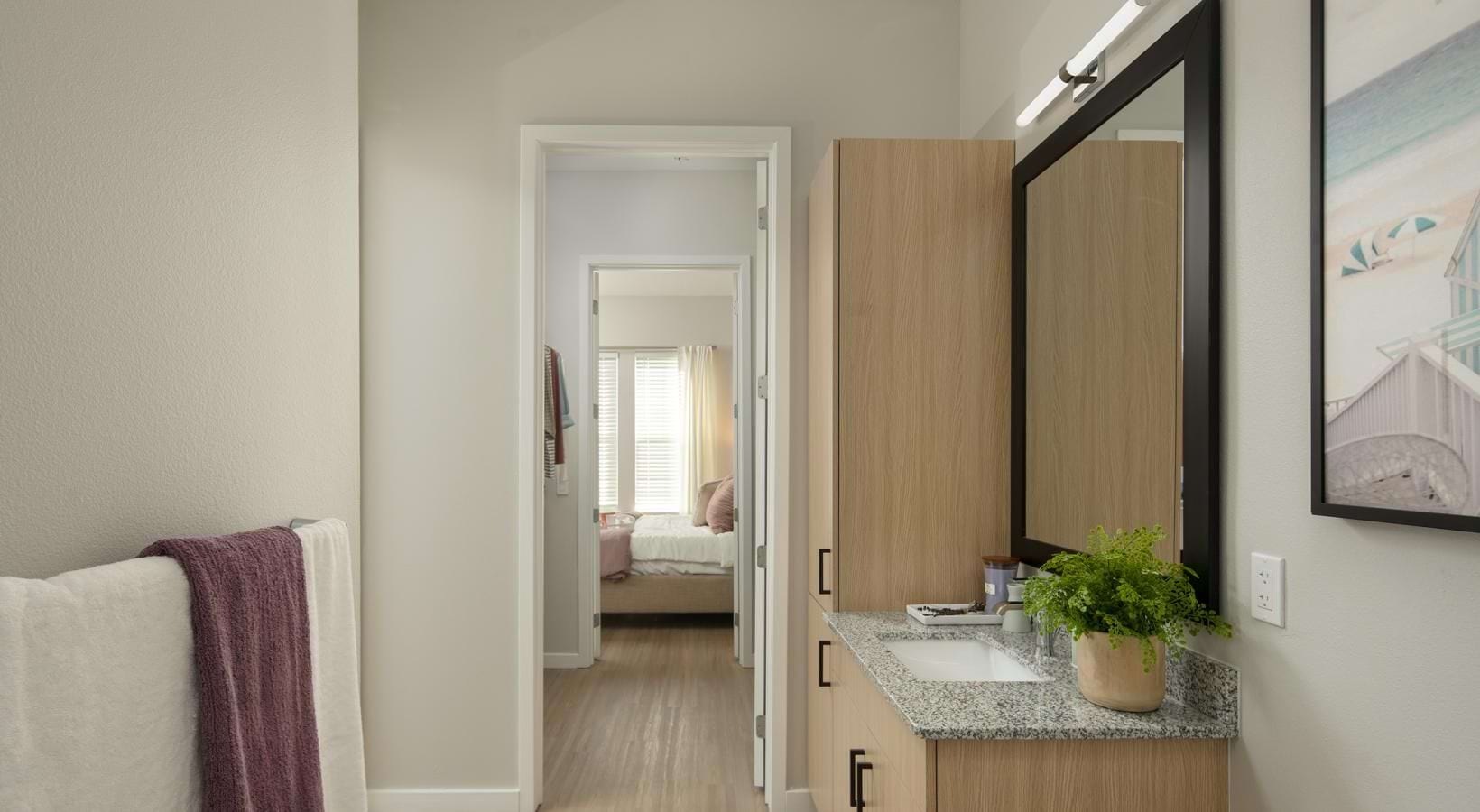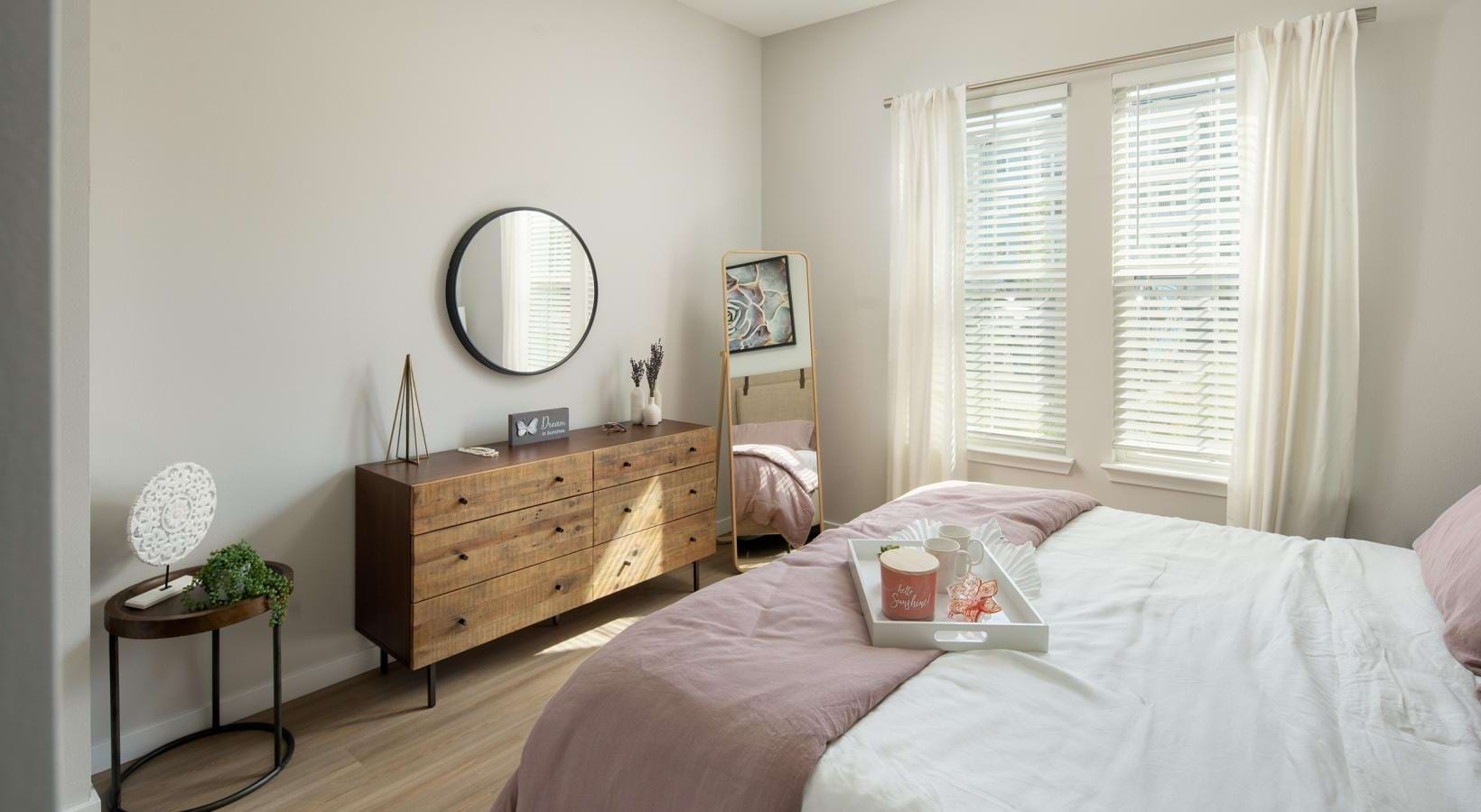 • a bedroom with a bed and a mirror
