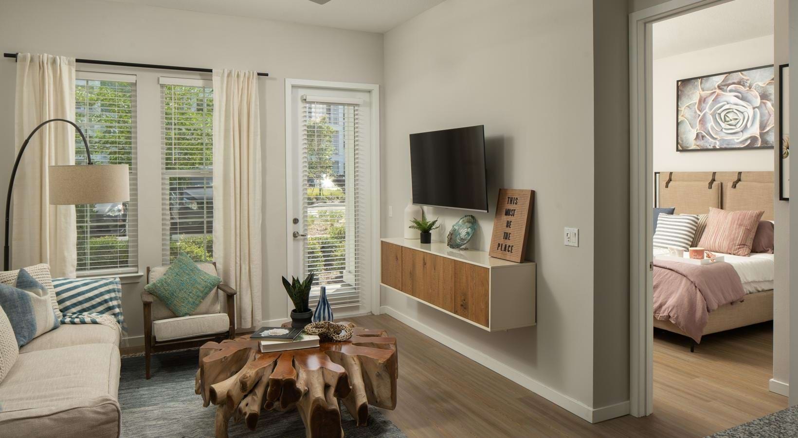 • a living room with a bed and a table