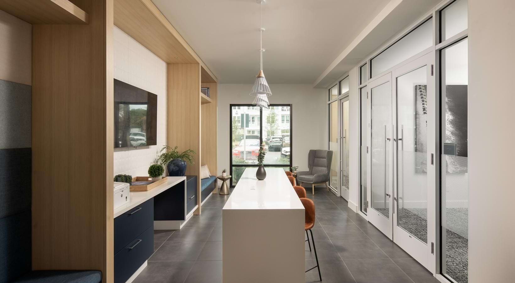 • a clubroom kitchen with a large island and chairs