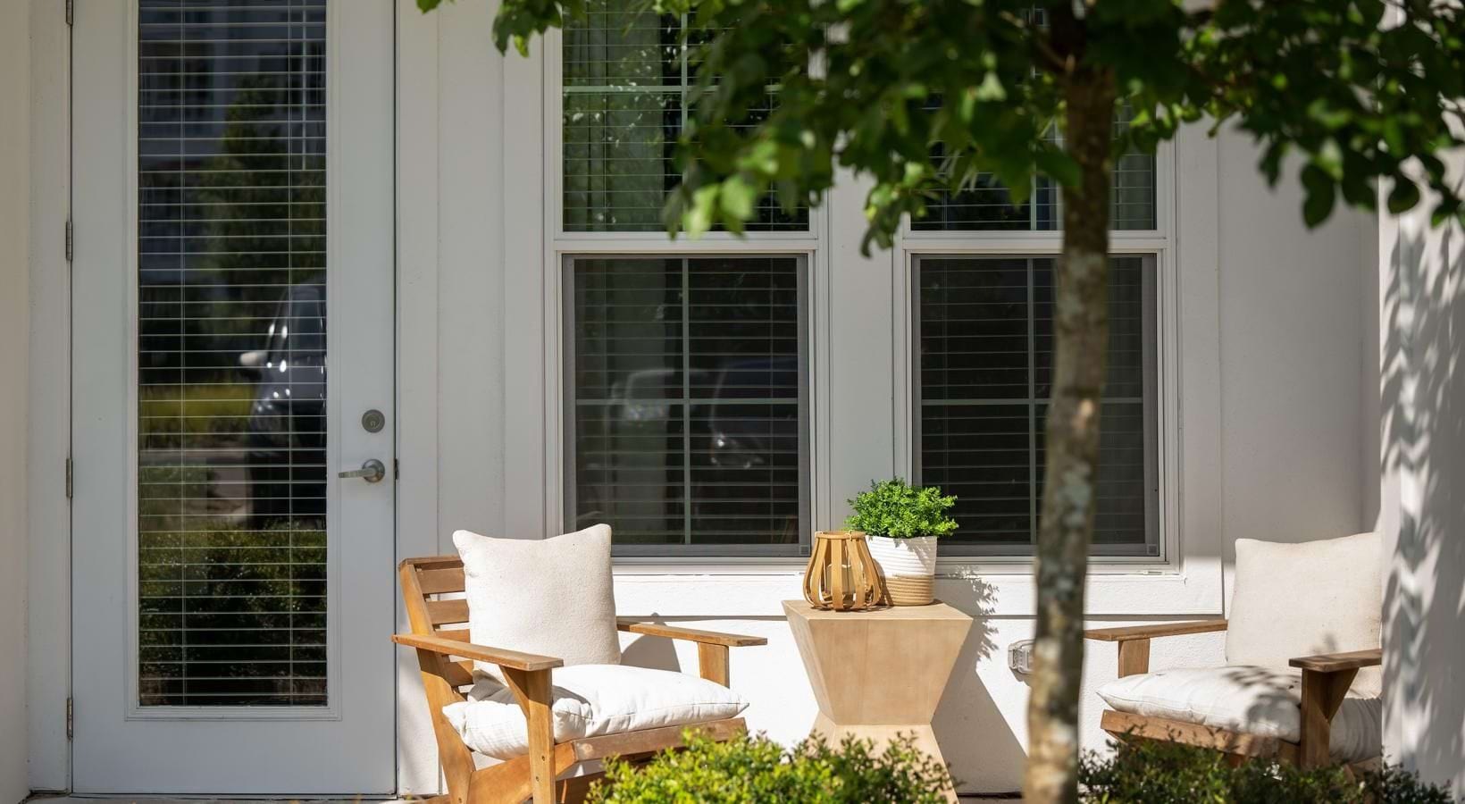 • a white house with a patio and a tree