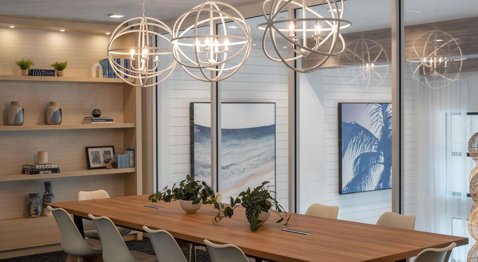 • a dining room table with chandelier above it