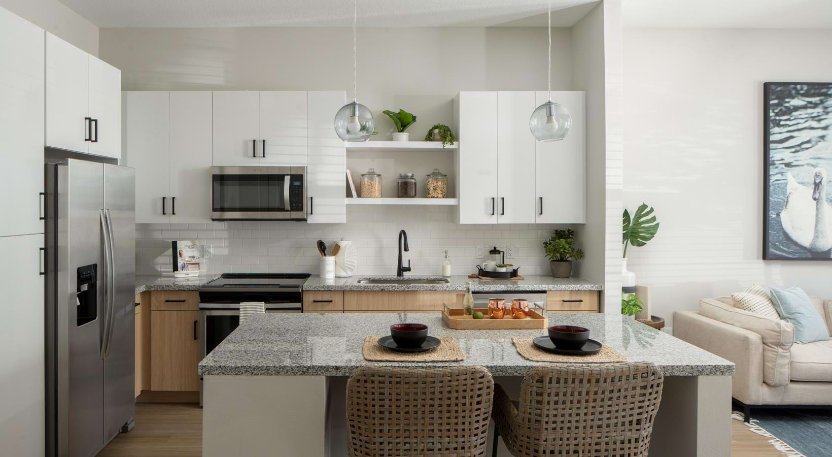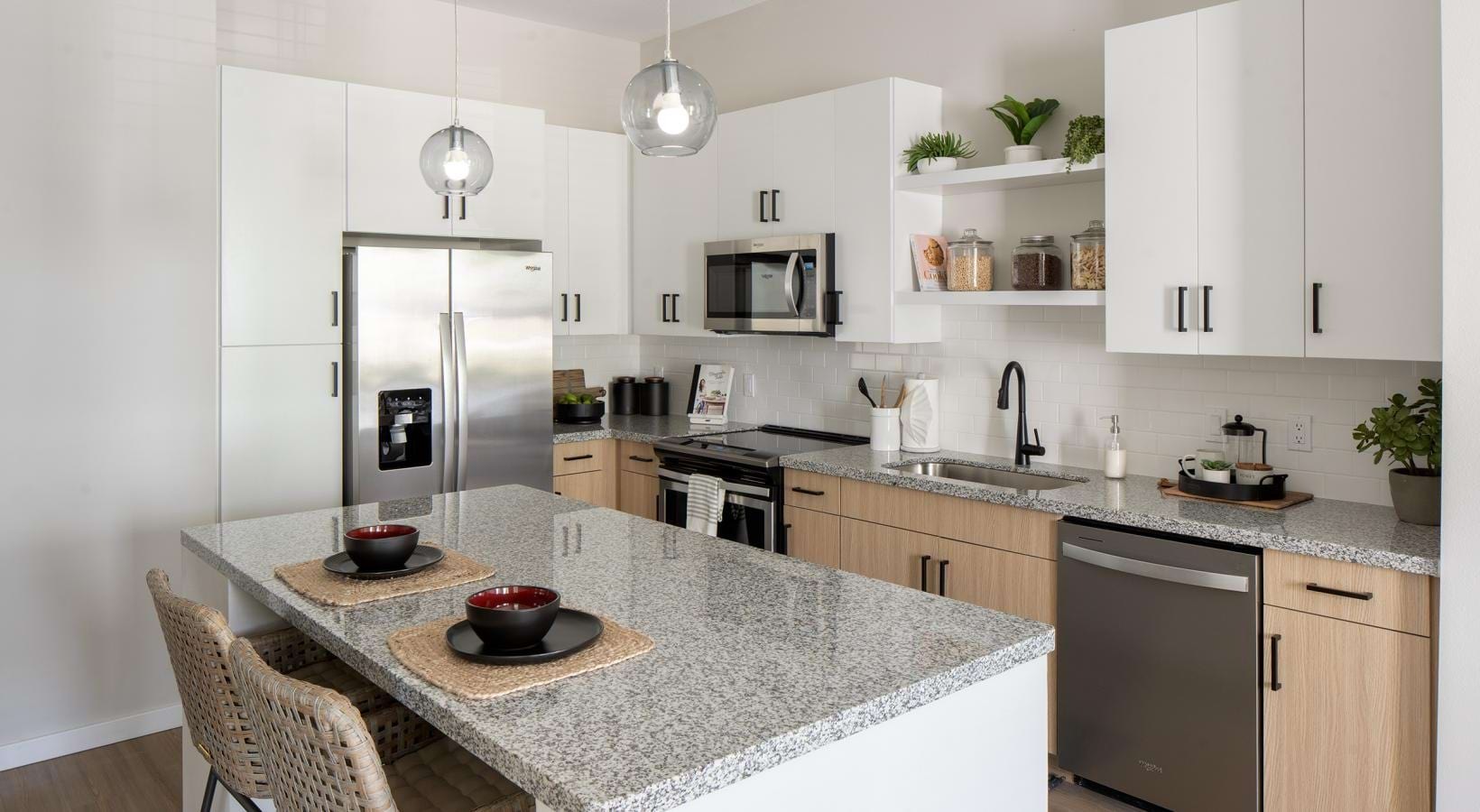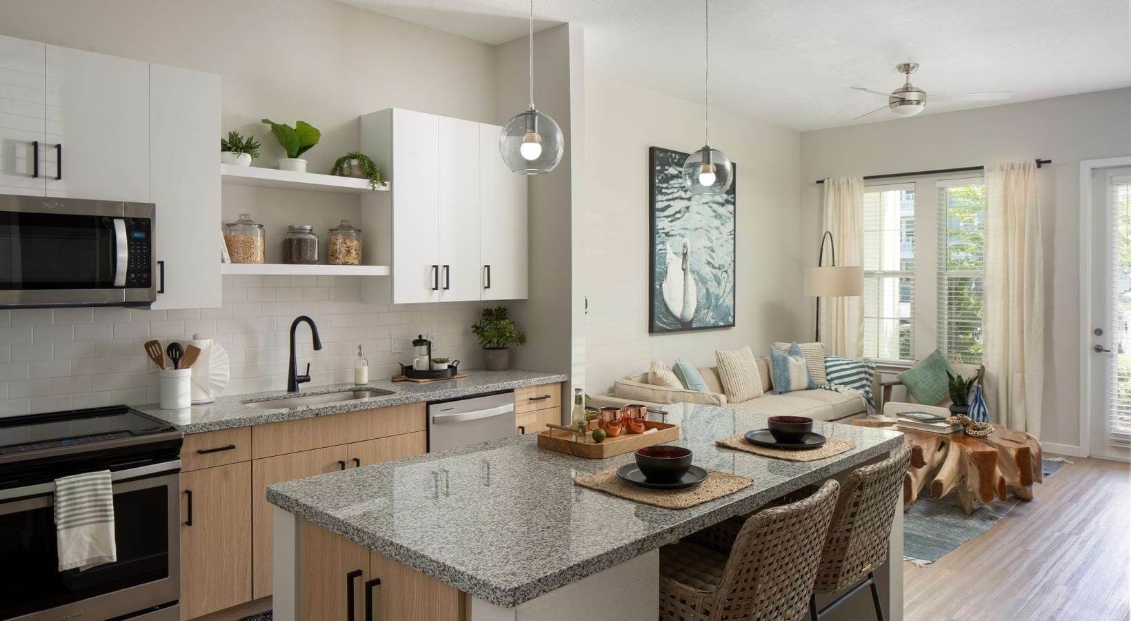 • a kitchen with a marble island
