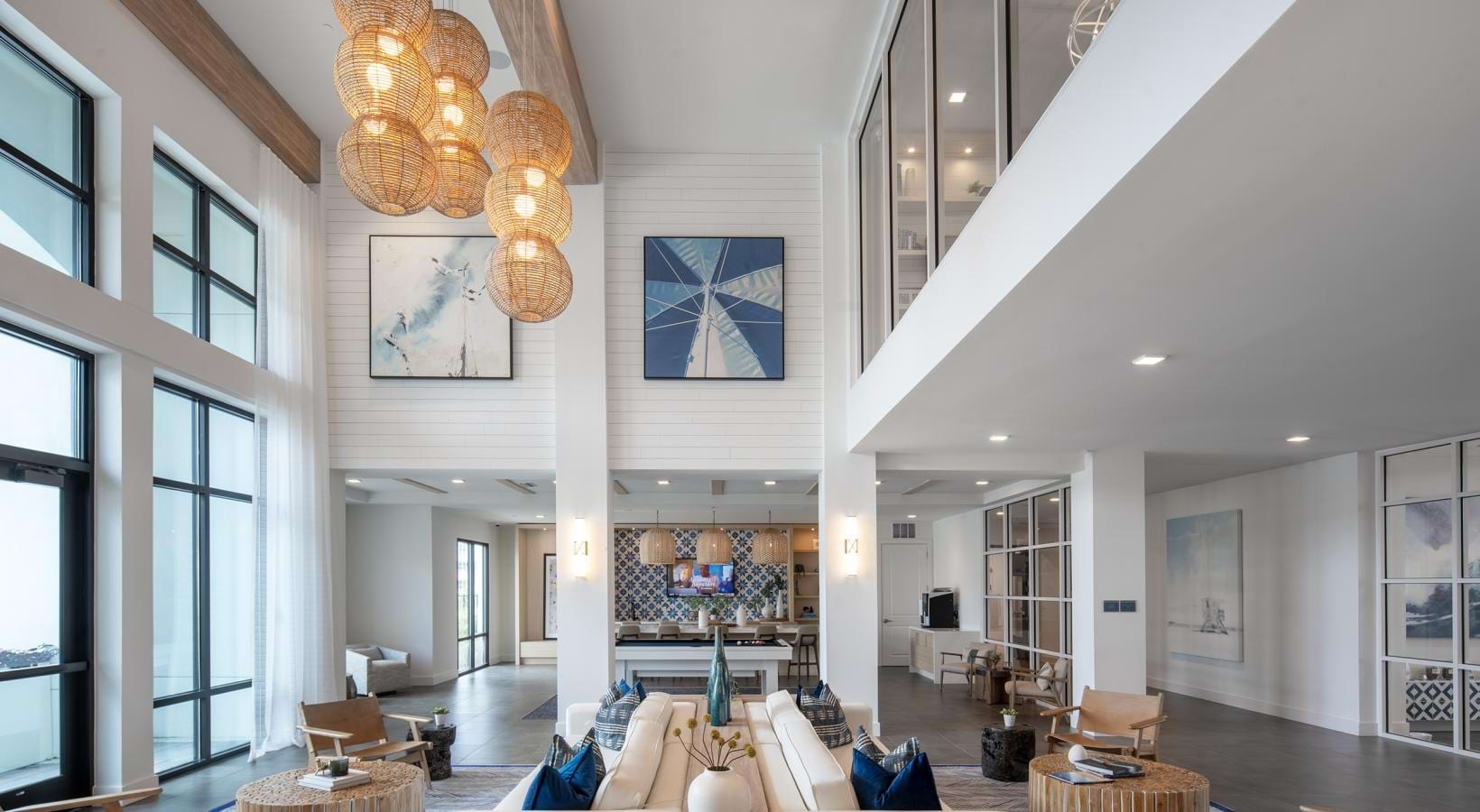 • a large room with a chandelier and a couch
