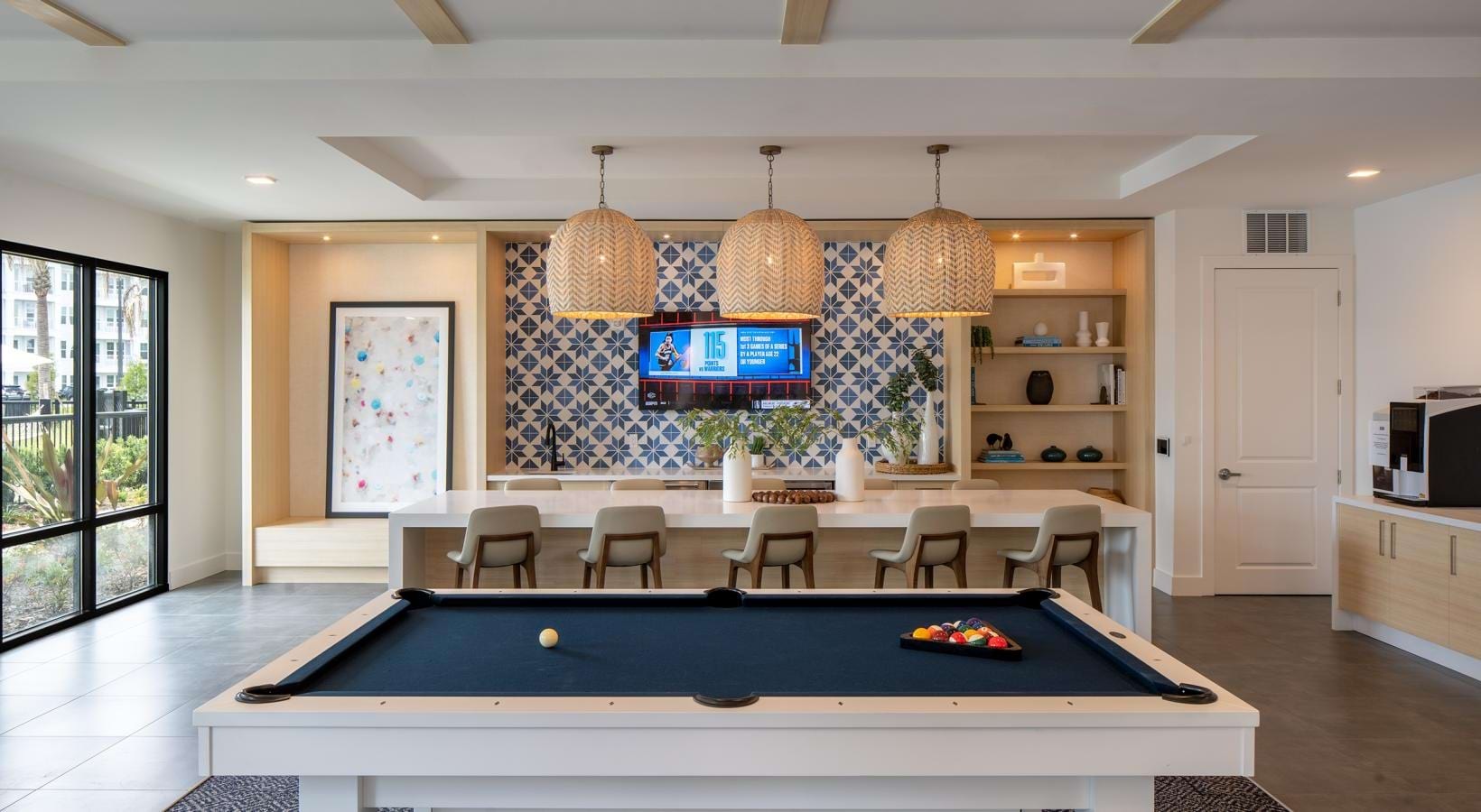 • a pool table in a room